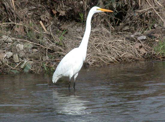 The Great Egret feeds in shallow water or drier habitats consuming mainly fish, frogs, small